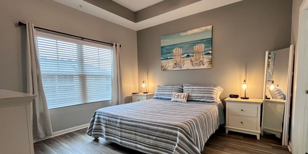 Ocean Breeze and Golf Tees is located in Barefoot Resort and Golf in North Myrtle Beach. This luxury 1328sf, third-floor, walk-up, dog-friendly golf villa sleeps up to eight with three spacious bedrooms and a queen sleeper sofa. The welcoming primary bedroom has a king bed with an en suite bath and oversized tub/shower combo to relax after your day at the beach. The second bedroom has a queen bed with plenty of space to spread out. The third bedroom has two twin beds and is perfect for the kiddos! All bedrooms have a closet and dresser for your personal items. Other comforts include room-darkening blinds and curtains, smart TV, and streaming capabilities for your favorite streaming accounts.